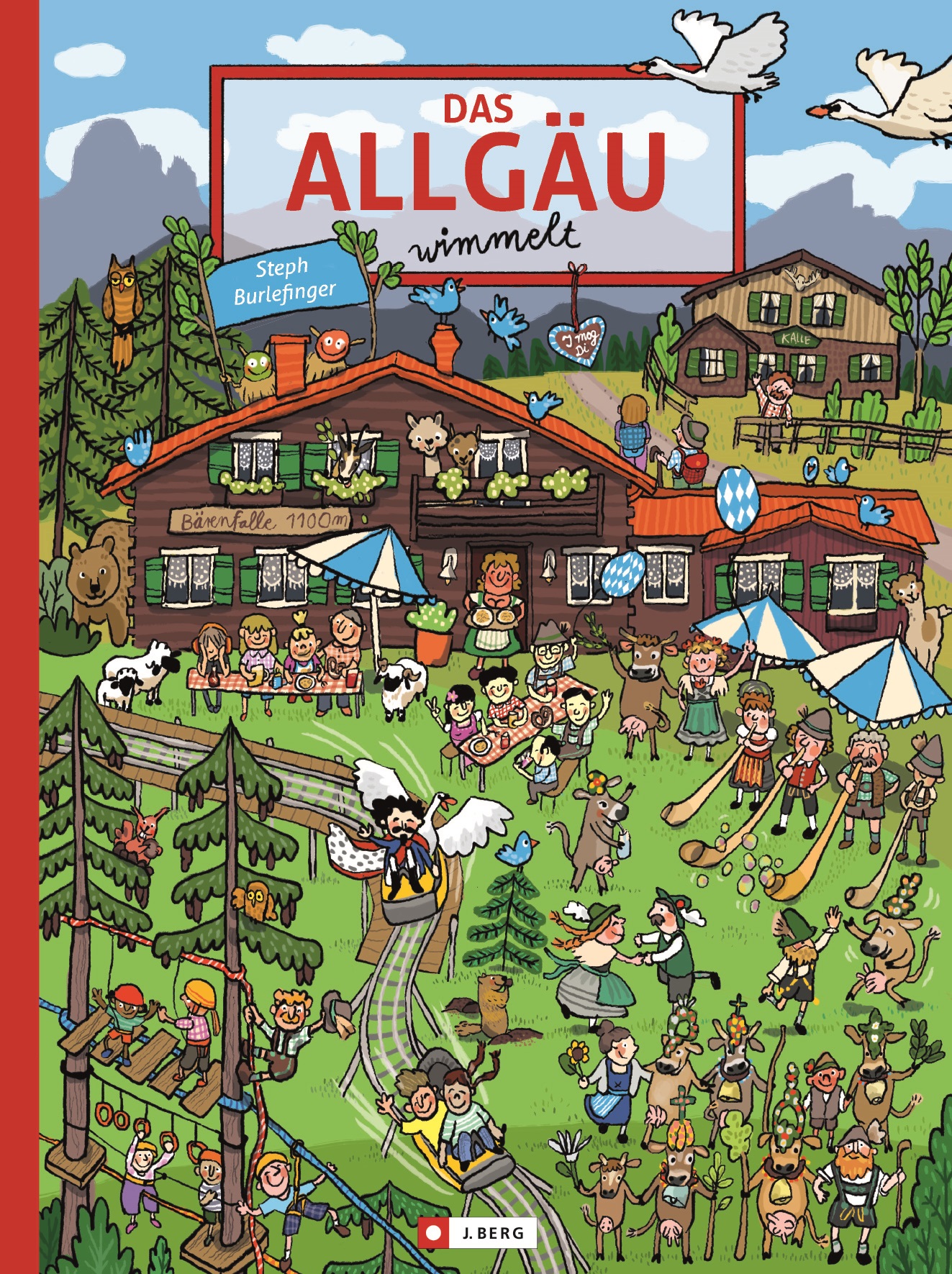 Endlich geht es auch hier im welligen Süden drunter und drüber! Im neuen Kinderbuch Das Allgäu wimmelt (J. Berg Verlag) stürzen sich Kuh Resi und ihre Freundin Mitzi ins Gewimmel und fahren mit dem »Alpsee Coaster«, besichtigen Neuschwanstein und Hohenschwangau und bummeln durch Kempten.