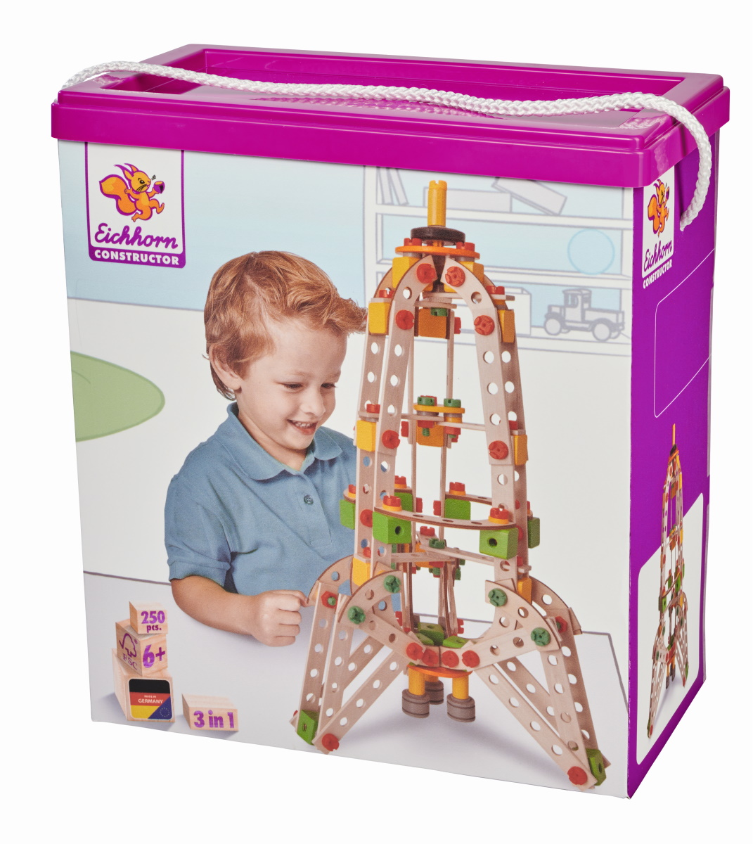 Die Produktlinie Eichhorn Constructor überzeugt mit ihrer großen Artikelauswahl, begeistert Klein und Groß und wird in Deutschland gefertigt. Zur Herstellung wird ausschließlich FSC® 100% Buchenholz aus nachhaltiger Forstwirtschaft verwendet. Aus Leisten, Klötzchen, Schrauben, Muttern und zahlreichen Sonderteilen entstehen verschiedene Bauwerke, Fahrzeuge und vieles mehr. Das Sortiment beginnt bei kleineren Sets mit 40 Teilen und reicht hin zu Sets mit bis zu 444 Teilen.