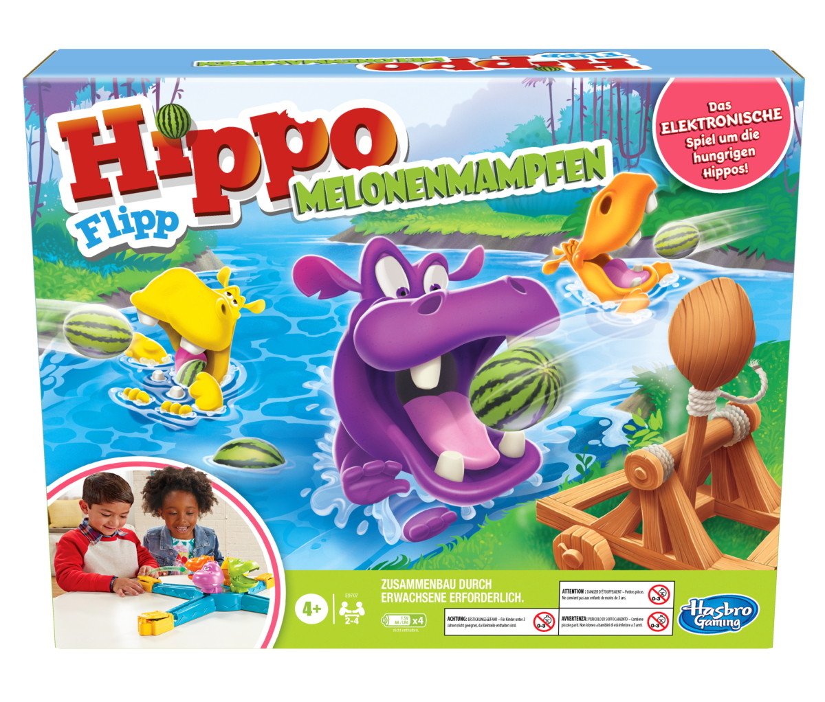 Bei einem Treffer kullert eine gemampfte Melone die Rampe herunter und in das Zählfach. Der Spieler, dessen Hippo zuerst 5 Melonen mampft, gewinnt! Genau wie das klassische Hippo Flipp Spiel eignet sich auch diese elektronische Version für Jungs und Mädchen ab 4 Jahren. Ein toller Spaß für Regentage, Spielverabredungen oder Familien-Spieleabende.