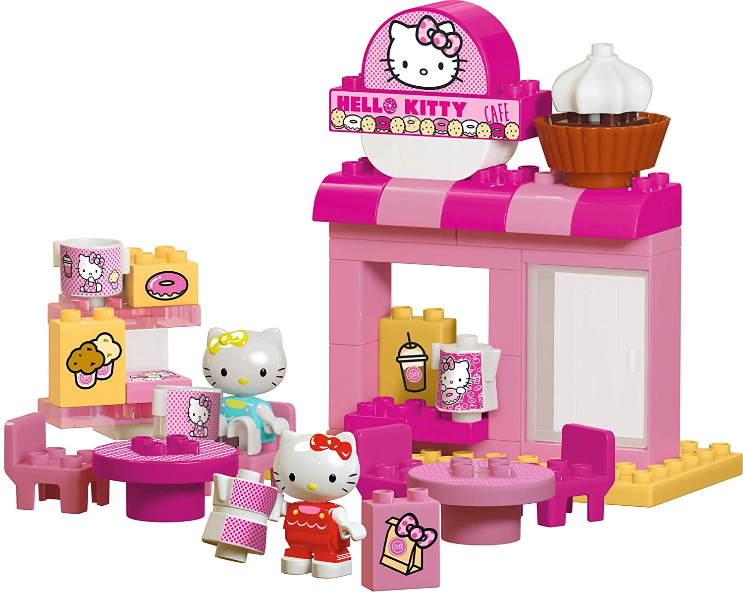 Das Spielset BIG-Bloxx Hello Kitty Café besteht aus 45 Teilen, inklusive zweier Hello Kitty Spielfiguren, eine mit pinkfarbener Kleidung und eine in Türkis. Das Café kann aus den Spielsteinen aufgebaut und liebevoll dekoriert werden. Im Set enthalten sind Kaffeekannen und Tassen sowie Tische und Stühle, so dass Hello Kitty viele Gäste zum Kuchen essen einladen kann.
