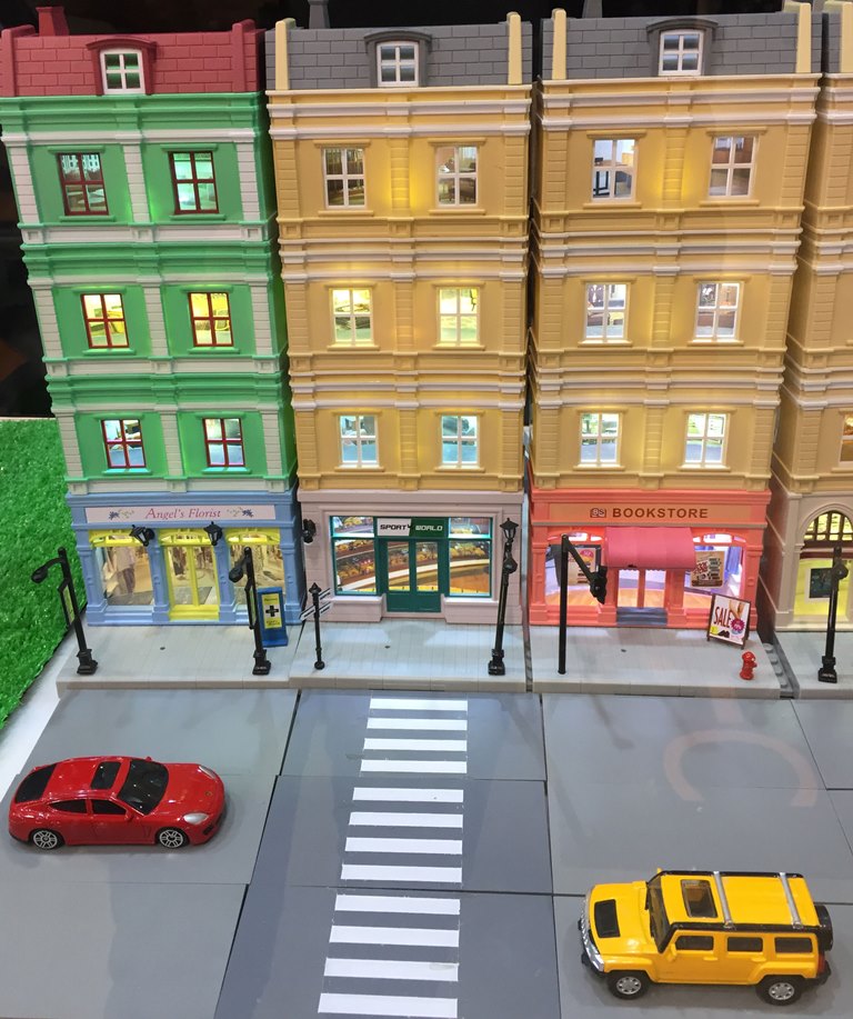 Die Produktlinie enthält jeweils ein Gebäude mit einem zugehörigen Bürgersteig und einem Straßenelement sowie einem Spielzeugauto.