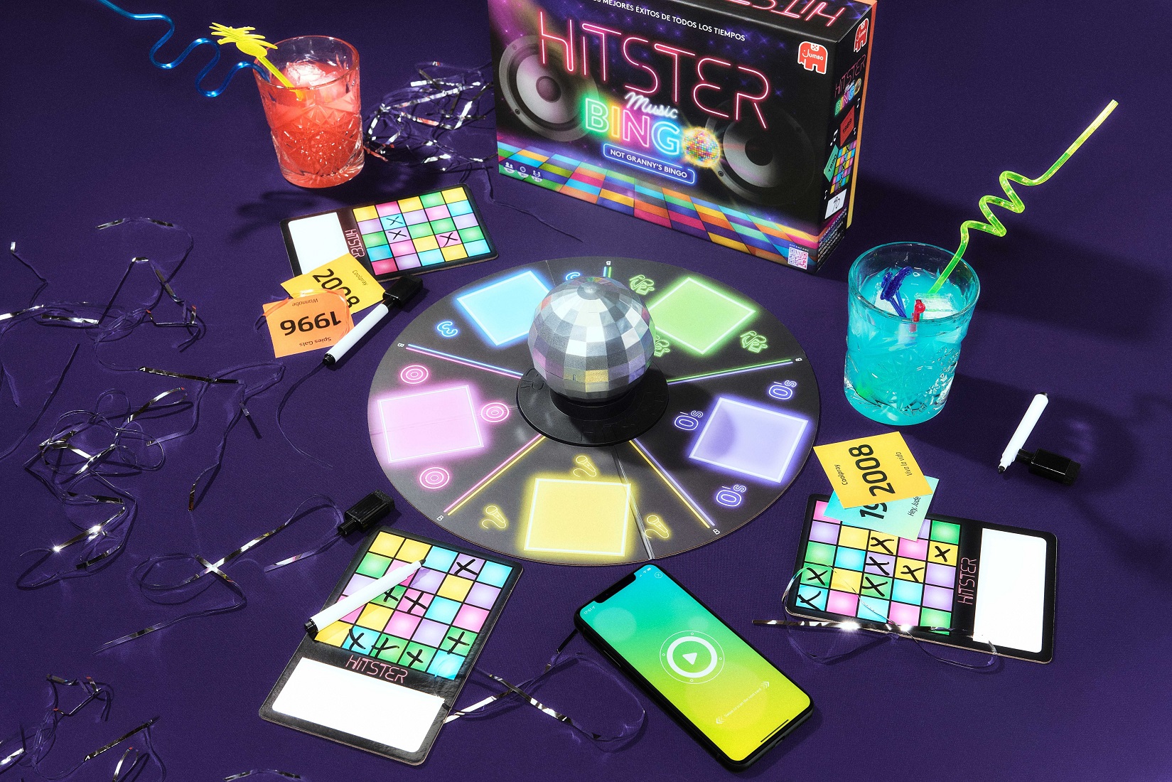 Hitster Bingo vereint das beste Partyspiel aller Zeiten mit Bingo. Mache dich bereit, die Discokugel zu drehen und zu den Beats zu grooven! Drehe die Discokugel, um die Kategorie aufzudecken, scanne die Karte und lass die Musik spielen.