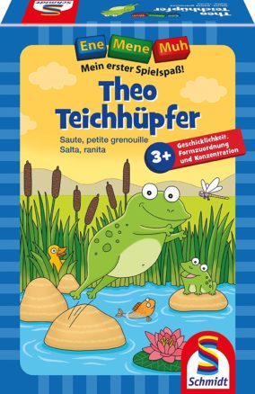 „Theo Teichhüpfer“ aus der beliebten ENE MENE MUH – Mein erster Spielspaß! – Reihe von Schmidt Spiele® ist für zwei bis vier Spieler ab drei Jahren geeignet und für etwa 17 Euro erhältlich. Über ENE MENE MUH spielt und lernt die Zielgruppe der ab Dreijährigen mit Spaß. Spiele aus dieser Reihe fördern die Aufmerksamkeit, Konzentration, Kombinationsfähigkeit und Sprache, erstes Zählen und Zuordnen von Farben und Formen. Die Spielidee für das Kinder-Brettspiel stammt von Ingeborg Ahrenkiel, die Illustrationen von Eva Künzel.