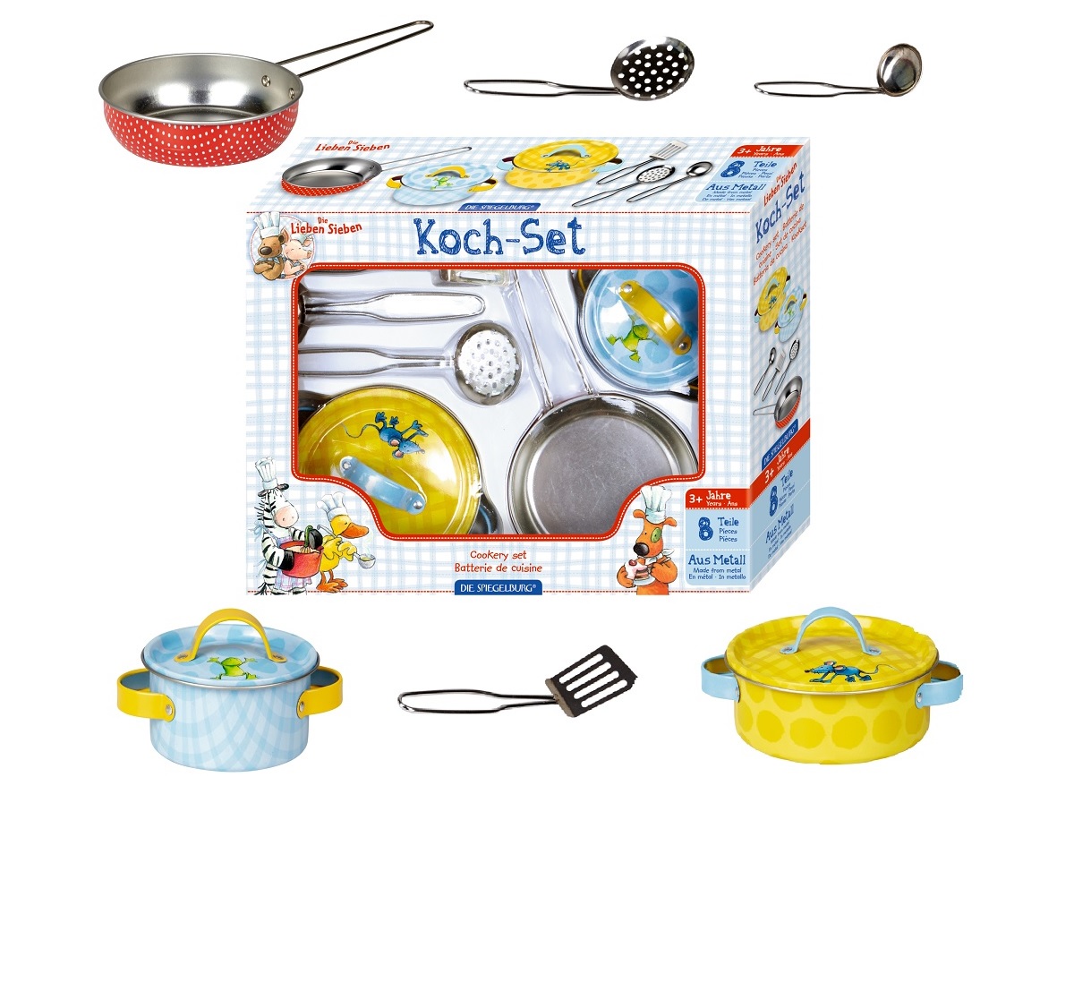 Kochen wie die Großen mit dem Koch-Set bestehend aus zwei Kochtöpfen, einer Pfanne, einem Pfannenwender, einer Keller und einem Schaumlöffel. Ab 3 Jahre.