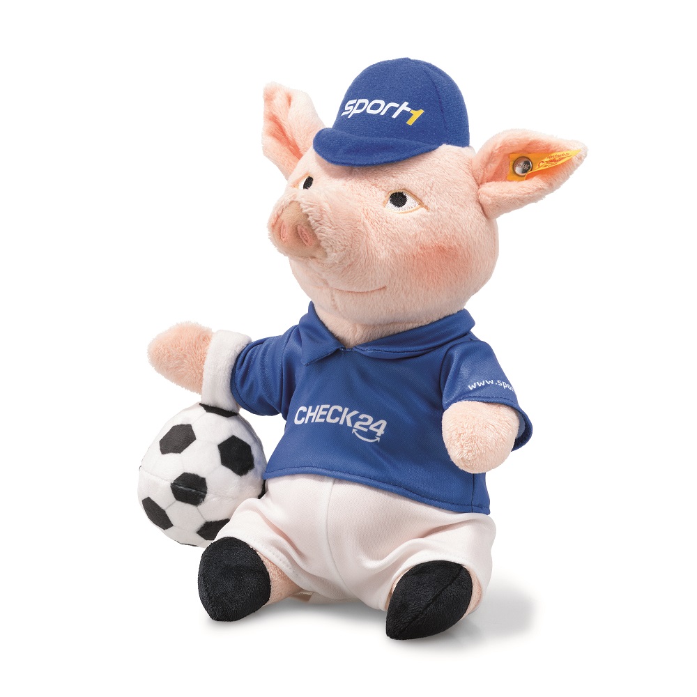 Auch Steiff ist großer Fan vom Phrasenschwein. So sehr, dass der sau-niedliche Gast mit Kultfaktor seit November auch in kuschelweichem Plüsch erhältlich ist. 22 cm groß, rosa und natürlich im Trikot sitzt das Phrasenschwein von Steiff an jedem Fußball-Stammtisch oder tobt mit den Profis von Morgen über den Fußballplatz.
