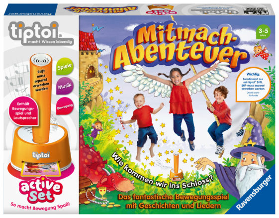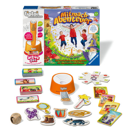 Im „Mitmach-Abenteuer“, dem neuen active Set von tiptoi®, spielt tiptoi® den Anfang einer Geschichte – und die Kinder entscheiden, wie sie weitergeht. Mit acht magischen Helfern bringen sie die Story in Schwung und sich selbst gleich mit. Denn zu jeder Aktion machen die Spieler entsprechende Bewegungen.