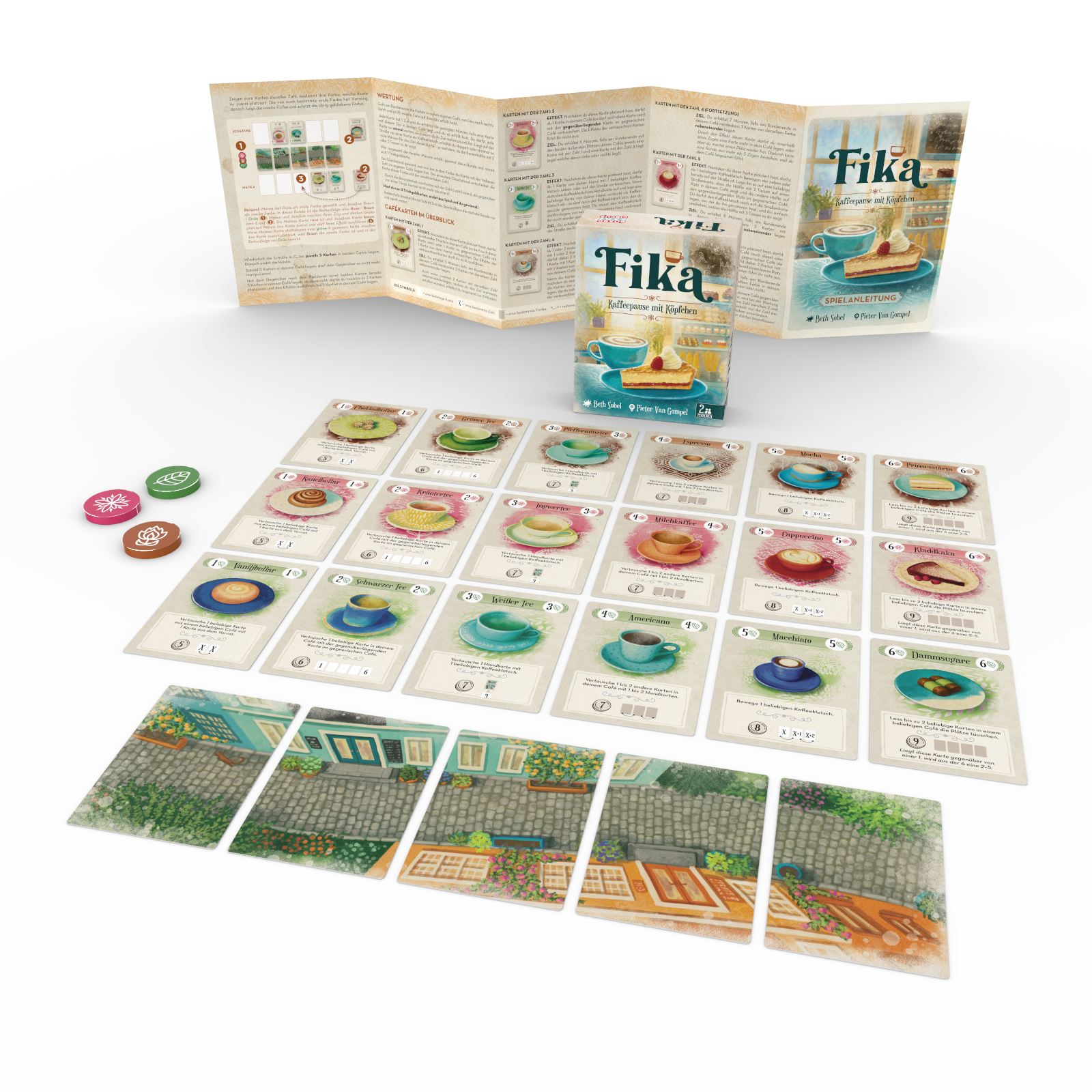 Fika wurde liebevoll und detailreich illustriert von Beth Sobel, die so wundervollen Spielen wie z. B. Flügelschlag Leben einhauchte. Das macht Fika auch optisch zum Leckerbissen.