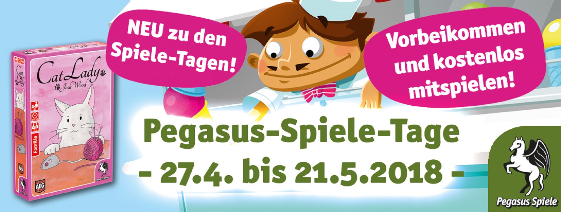 Auch in diesem Frühjahr veranstaltet Pegasus Spiele wieder die Pegasus-Spiele-Tage in Kooperation mit stationären Fachhändlern und die Pegasus-Spiele-Clubtage zusammen mit den Spieleclubs. Dafür wurden Spielepakete an die teilnehmenden Veranstalter versandt, sodass den Besuchern nun eine breite Auswahl an Spieleneuheiten des Friedberger Pegasus Verlags zur Verfügung steht.
