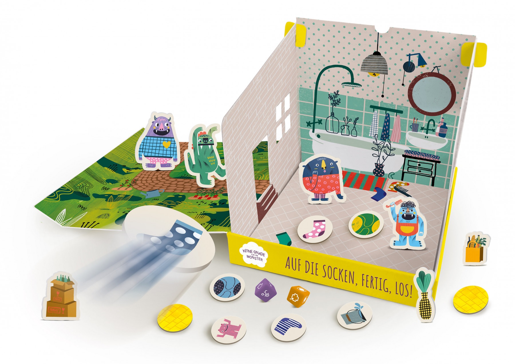 Öffnet die Schachtel und klappt die Klappen auf, um ein Haus zu bauen, und platziert die Monster im Garten. Eines von ihnen betritt den ersten Raum … Schnell! Der erste Spieler würfelt und zieht ein Token. Er muss eine Socke auf das Monster werfen, indem er gleichzeitig ein Auge schließt.