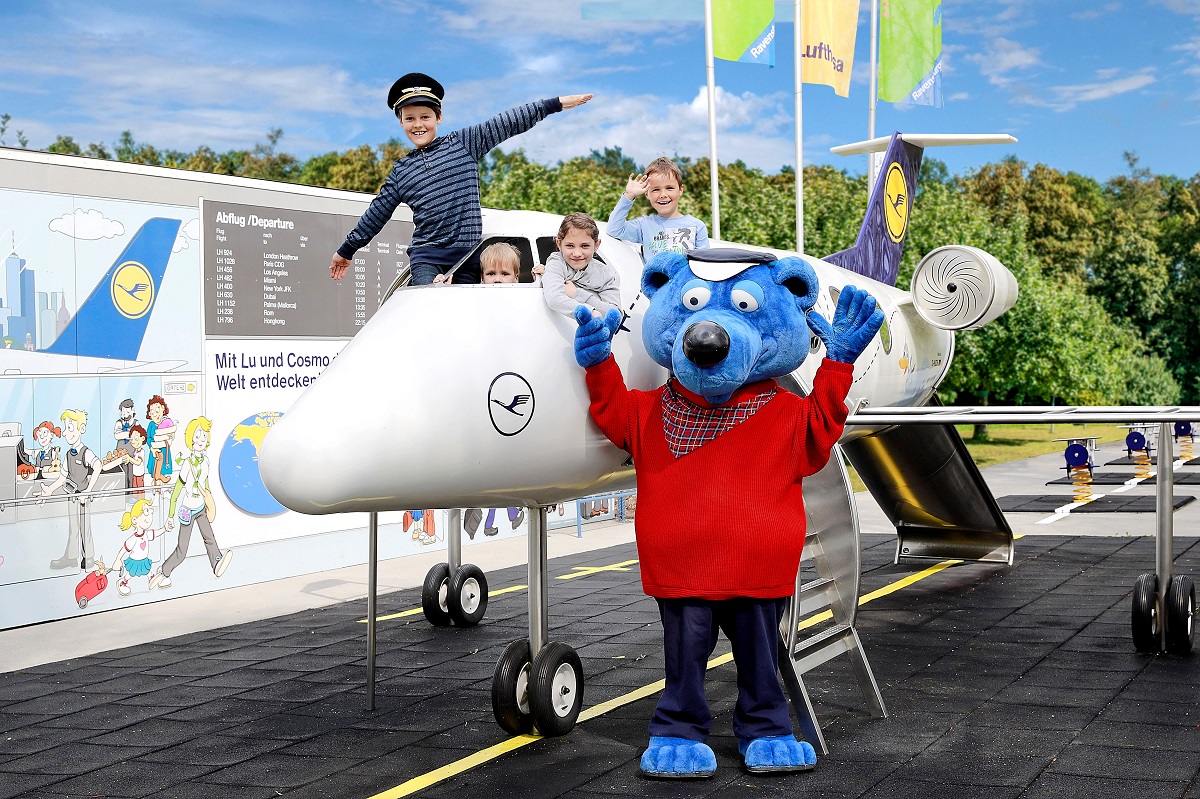Zusätzlich zum Flieger können Kinder an einem Weltkarten-Großspiel selbst zum Pilot werden und einige der wichtigsten Destinationen der Lufthansa anfliegen. Eine Kulissenwand lädt Kinder ein, mit den Maskottchen Lu und Cosmo die spannende Welt des Flughafens zu entdecken.