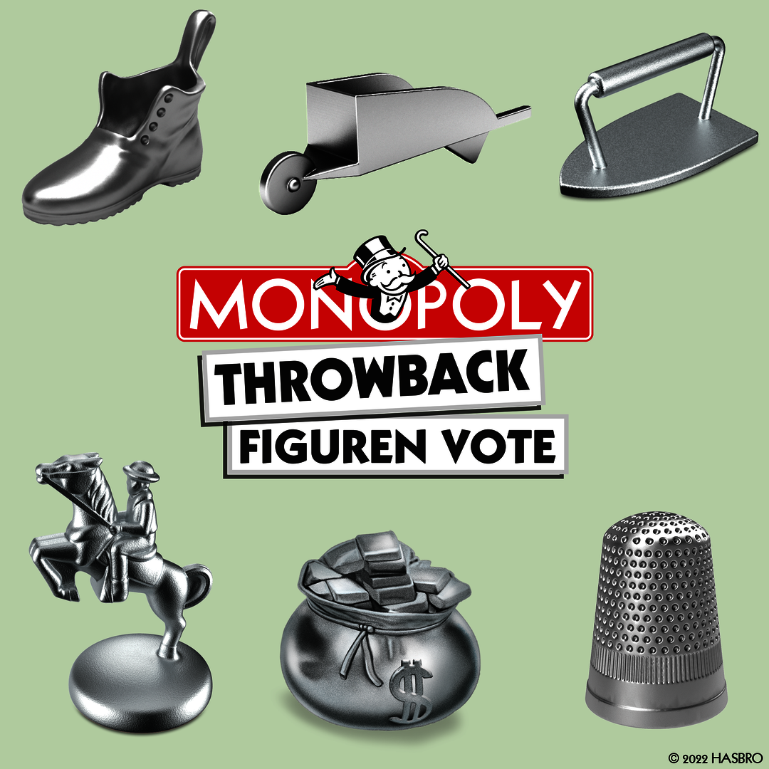 Jetzt erhalten die Fans die einzigartige Chance, eine der kultigen Figuren wieder in das Brettspiel zurück zu wählen. Unter www.MonopolyTokenVote.com kann jede:r weltweit ab dem 28.04.2022 darüber abstimmen, welche das sein wird. Zur Wahl stehen sechs Spielsteine, die in den Neunzigern durch das beliebteste Brettspiel aller Zeiten führten: Fingerhut, Schubkarre, Bügeleisen, Stiefel, Pferd und Reiter sowie Geldbeutel. Online kann bis zum 20.05.2022 für den Favoriten gestimmt werden. Die Gewinner-Spielfigur wird dann ab 2023 weltweit in die klassische Monopoly Version integriert.