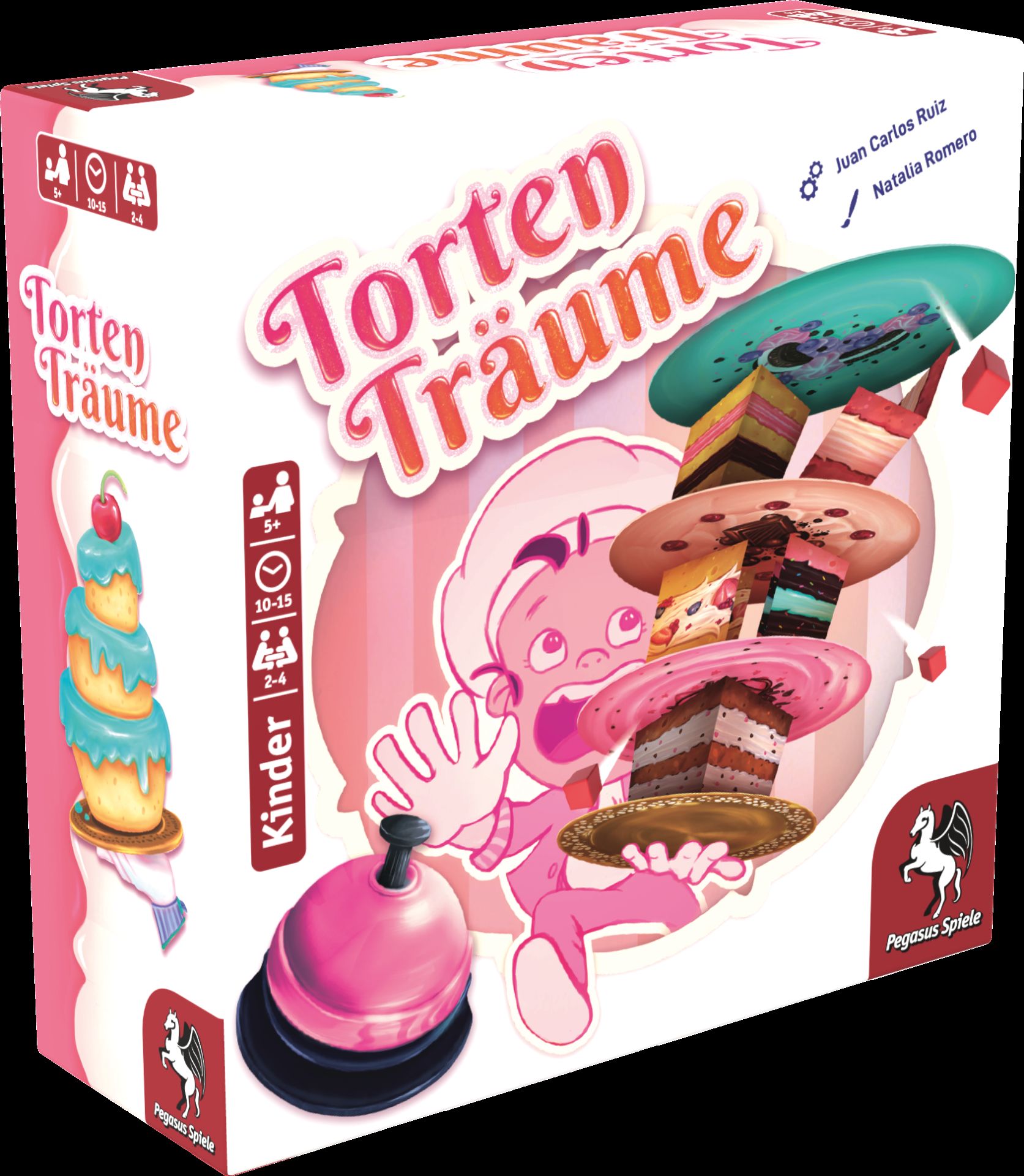 Torten Träume von Juan Calor Ruiz mit Illustrationen von Natalia Romero ist ein rasantes Geschicklichkeitsspiel. Dank der simplen Regeln können Kinder problemlos allein spielen, aber auch im Spiel mit Erwachsenen bleibt jede Partie spannend, denn während Kinder ihre Torte auf dem Boden oder Tisch stapeln dürfen, müssen Erwachsene sie auf ihrer Hand balancieren.