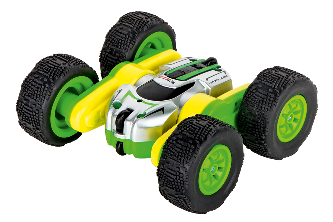 Der Carrera RC Mini Turnator ist um einiges kleiner als das große Vorbild, steht ihm aber in Sachen Stuntaction in nichts nach. Nach einem Update erstrahlt der kleine Flitzer in gelb und grün.