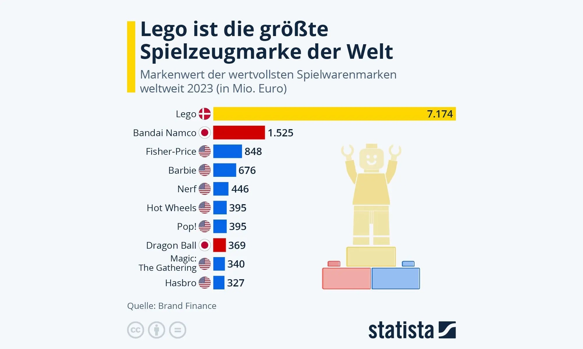 Mit einem geschätzten Wert von fast 7,2 Milliarden Euro ist Lego laut Brand Finance die größte Spielzeugmarke der Welt. Das dänische Unternehmen aus Billund führt den Markt mit großem Abstand an.