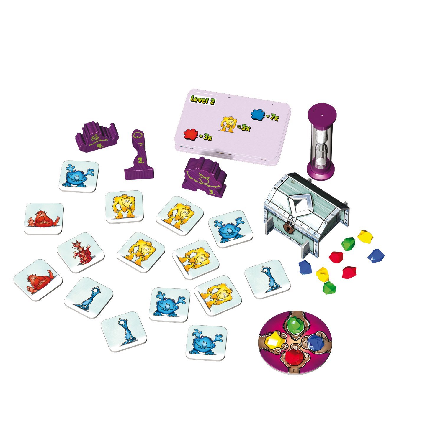Die Monsterplättchen sind doppelseitig bedruckt, aber mit unterschiedlichen Motiven. Dann erhält jeder eine kleine Schatztruhe und jetzt werden nur noch die Aufgaben gemischt und schon kann das Spiel beginnen. Am besten beginnt man mit Level 1, welches auch Kinder ab 6 Jahren bewältigen können.