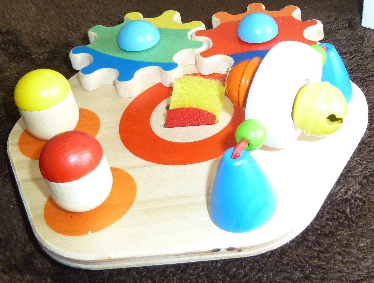 Diese frühkindliche Erlebnisscheibe überzeugt durch ihre farbenfrohe Aufmachung. Die Zahnräder, Stöpsel und Glöckchen laden unsere Kleinen zum Erkunden ein.