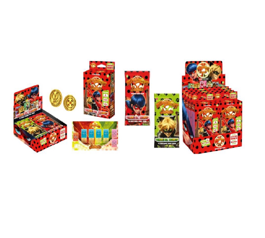 Die 22 Geheimnis-Karten erscheinen sogar im Thermo-Rainbow-Foil-Design, bei dem das Geheimnis der Karte erst durch Kontakt mit Wärme enthüllt wird. Die Booster enthalten 10 zufällige Karten und werden im Display à 24 Booster geliefert. Zum Launch des Miraculous Sammelkartenspiels in Deutschland und Österreich erscheint neben den Boostern auch ein Starterdeck mit einem spielfertigen Deck mit 29 Karten.