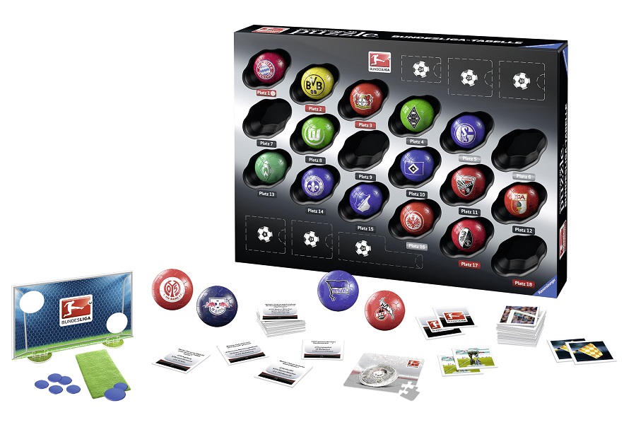 Der Ravensburger Bundesliga Adventskalender bietet nicht nur 24 Mal Puzzle- und Spielspaß, sondern wird nach dem Öffnen aller Türchen zur Bundesliga-Tabelle. In den 24 Türchen stecken 18 Ravensburger 3D Puzzle-Bälle mit den Logos der deutschen Erstligisten und sechs weitere Überraschungen für echte Fußball-Fans wie ein Torwandspiel, Quizfragen und memory® Karten.