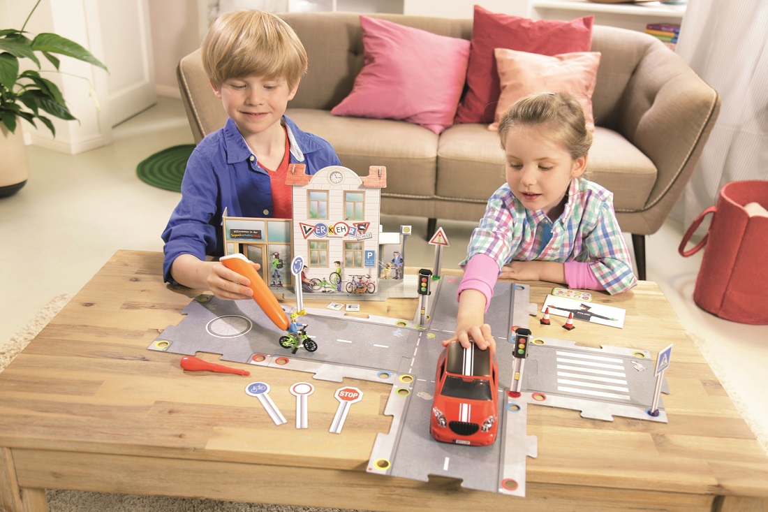 Wo ist der „tote Winkel“? Die „tiptoi® Spielwelt Verkehrsschule“ mit Unterrichtsgebäude, flexiblem Parcours, Auto, zwei tiptoi® Spielfiguren sowie Ampeln und Verkehrsschildern bietet Kindern von vier bis acht Jahren eine ereignisreiche Verkehrswelt für kreative Rollenspiele.