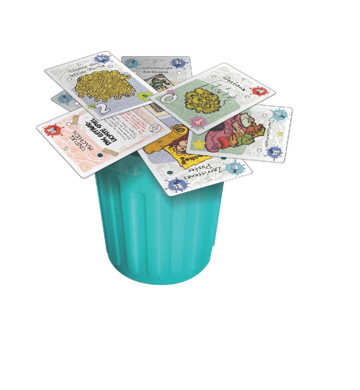 Bei Müll-Party wechseln sich die Spieler damit ab, eine Müllkarte nach der anderen geschickt auf den überlaufenden Mülleimer aufeinanderzustapeln oder Müll in ihrem Zimmer zu verstecken.