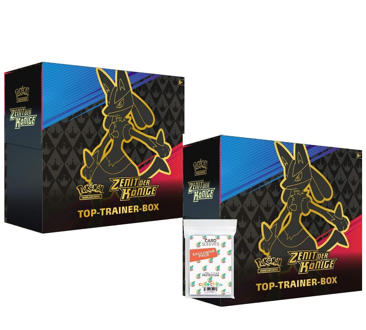 Top-Trainer-Box Zenit der Könige: Enthält 10 Boosterpacks der Erweiterung Zenit der Könige, 1 geprägte besondere Illustrationskarte mit Lucario-VSTAR und verschiedenes Spielzubehör