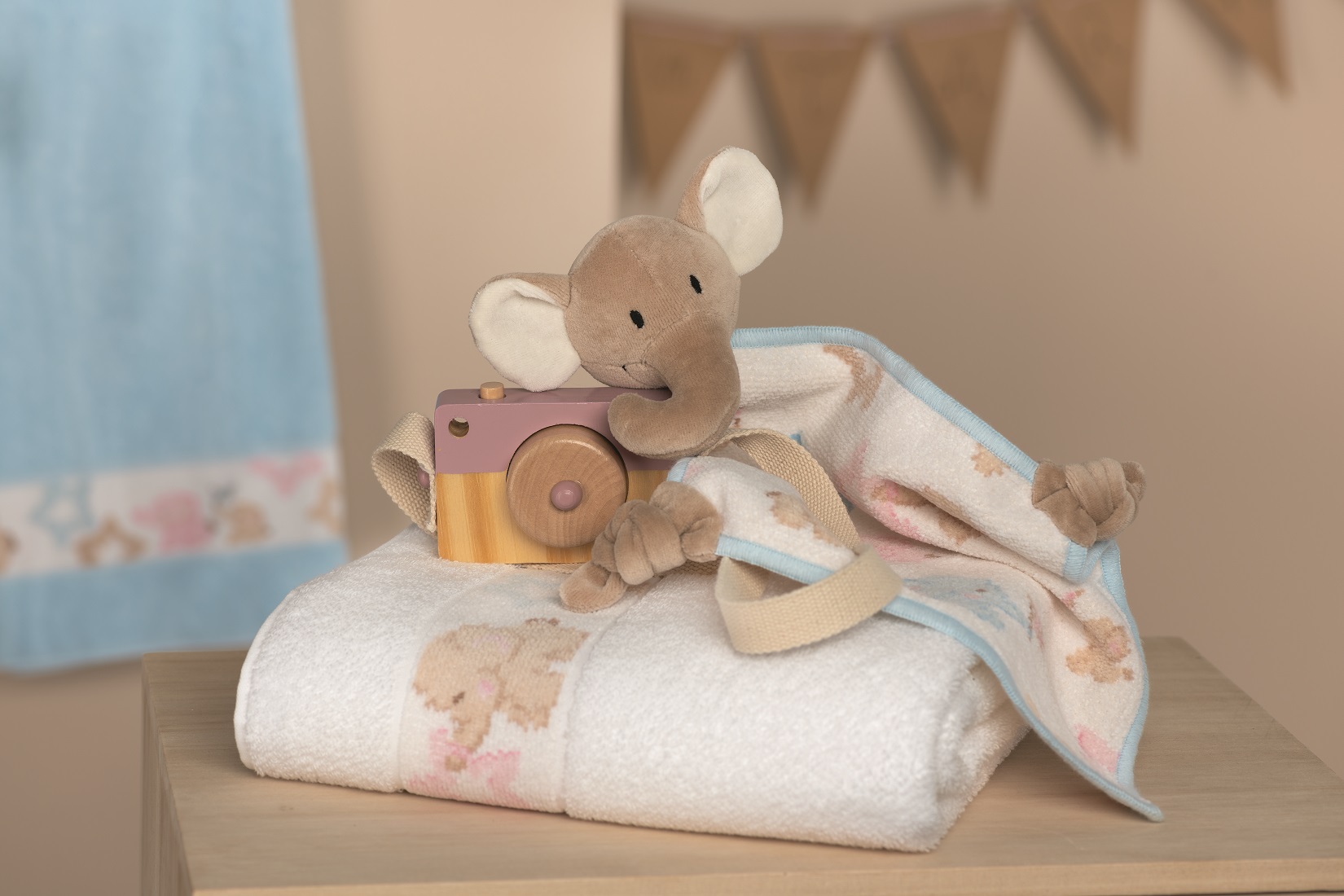Die Artikel TARA BORDER in Weiß, Himmel-Blau und zartem Rosa sind aus Frottier gefertigt und mit einem Chenille-Streifen verziert. Highlight der Kollektion ist das kleine Schnuffeltuch aus Voll-Chenille mit niedlichem Elefanten-Kopf.