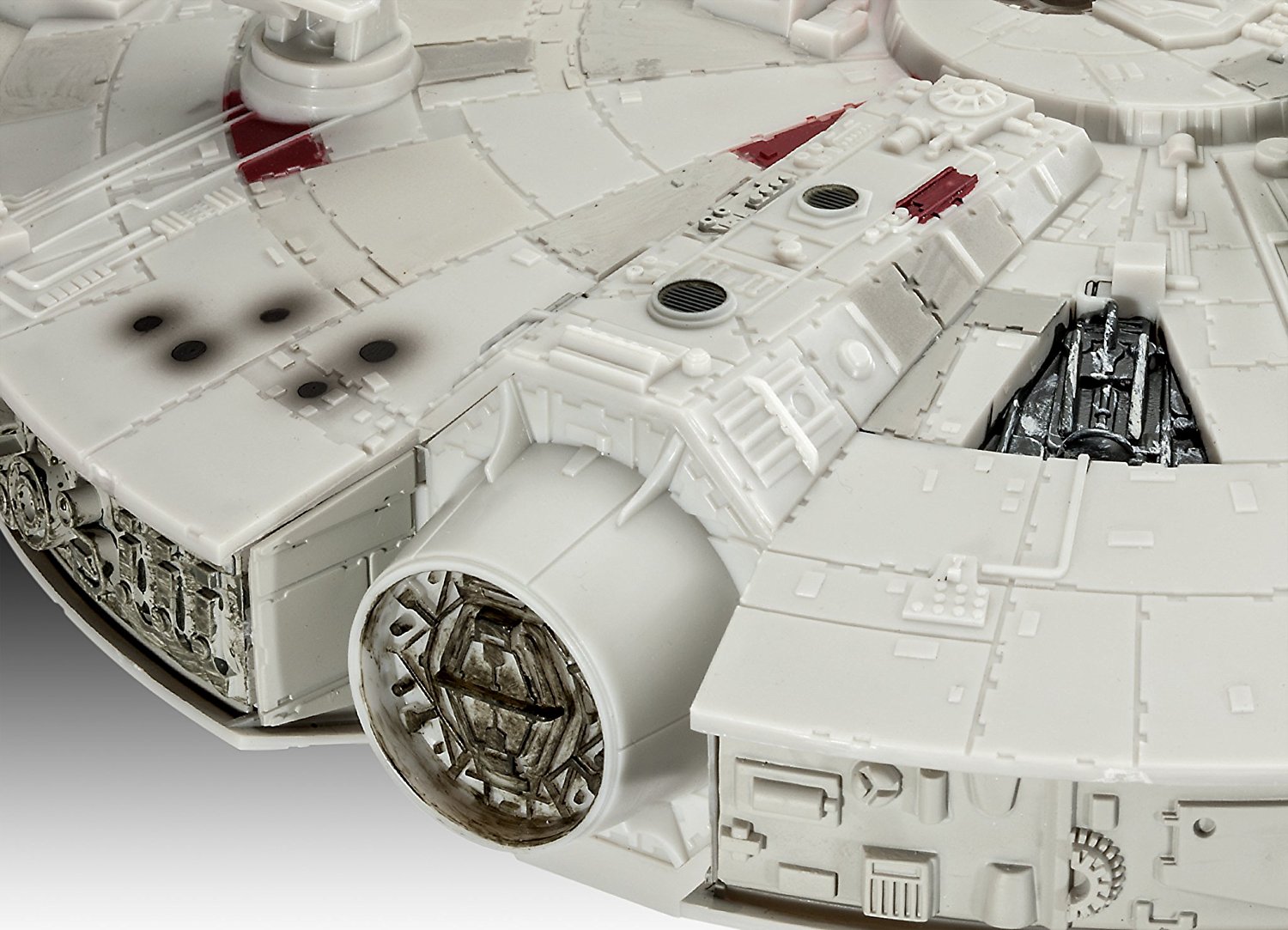 Typisch für das markante Fluggerät ist das blau aufleuchtende Triebwerk, das auch beim Bausatz gut zur Geltung kommt. Der Millennium Falcon von Revell verfügt zudem über ausfahrbare Landebeine, unterschiedliche Triebwerks- und Kampfgeräusche sowie eine Radarantenne und drehbare Kanone.