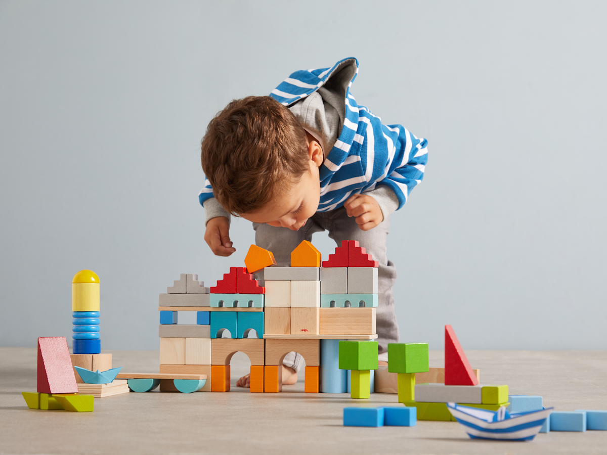 Die Bauteile überzeugen auf ganzer Linie: Gut zu greifen können schon kleine Architekt:innen ab einem Jahr erste Türmchen und kunstvolle Bauwerke gestalten. Aus ersten, wackligen Stapeln werden schnell richtige Gebäude. Die geometrischen Formen fördern ganz nebenbei die AugeHand-Koordination und Kinder entwickeln immer komplexere Kreationen.