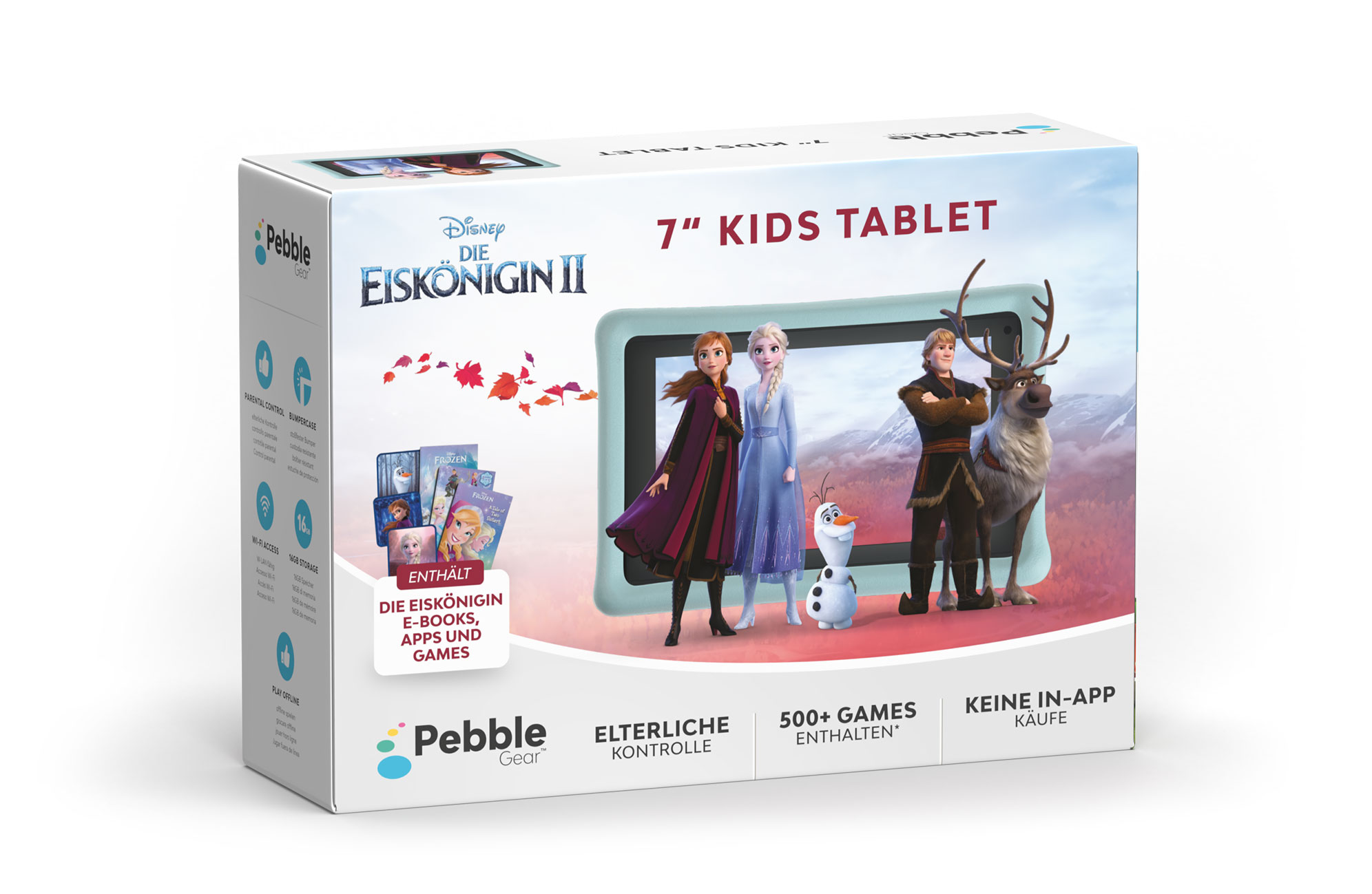 Zum Lieferumfang gehört das 7“Tablet im Frozendesign (blau), dem Bumper (Schutzhülle), dem Ladegerät mit Kabel (EU/UK), sowie dem Benutzerhandbuch (in 3 Sprachen).