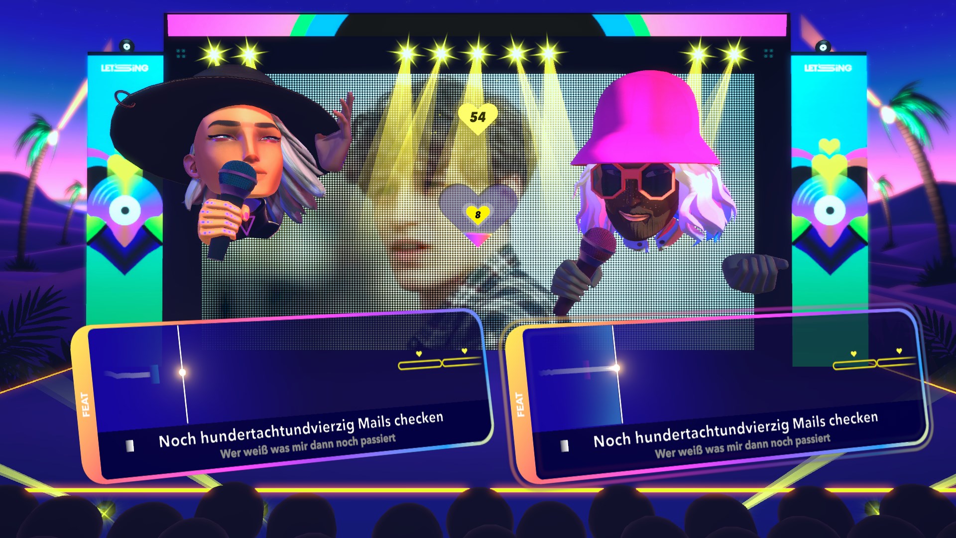 Hier gibt es eine Lobby mit einer Endlosschleife von Songs und einer globalen Echtzeit-Rangliste. Dann singt jeder zur gleichen Zeit den gleichen Song, so dass man immer alles geben muss, da man nie weiß, wie hoch die anderen Spieler punkten werden.