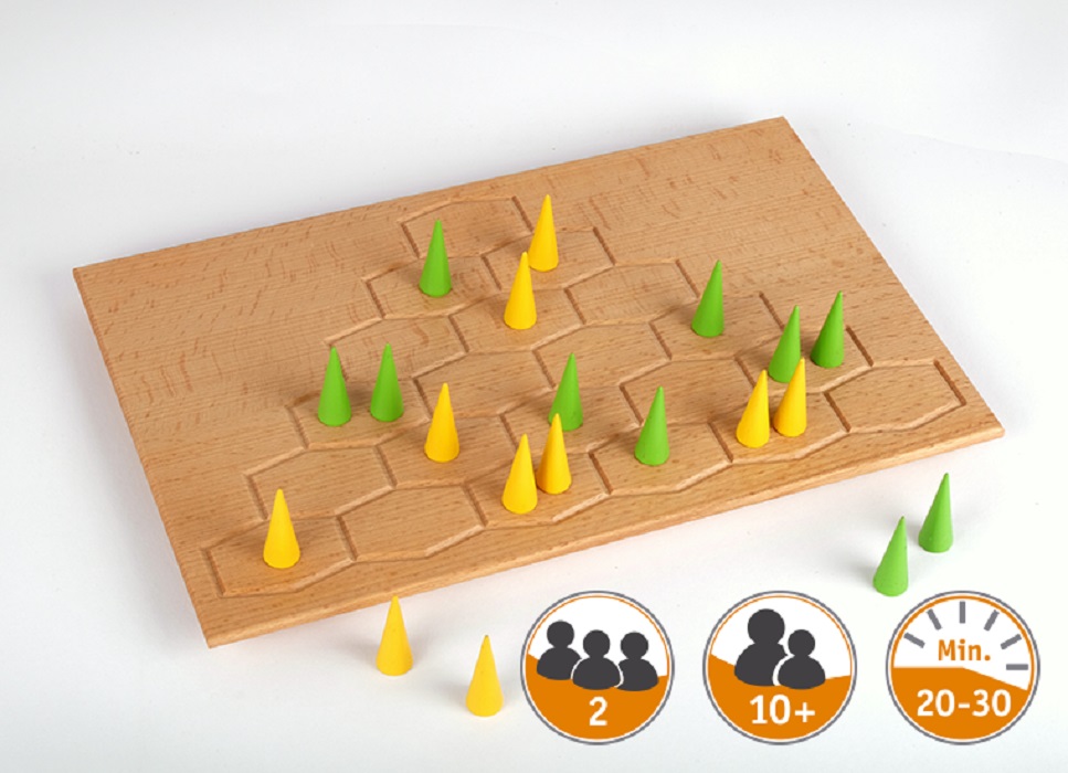 Erst wenn in einer Reihe überall Figuren stehen, dazu zählen auch die gegnerischen Figuren, kann man mit seinen Figuren eine weitere Ebene hochziehen. Sobald man dies getan hat, muss man eine Figur abgeben, sie kommt wieder in unseren Vorrat.