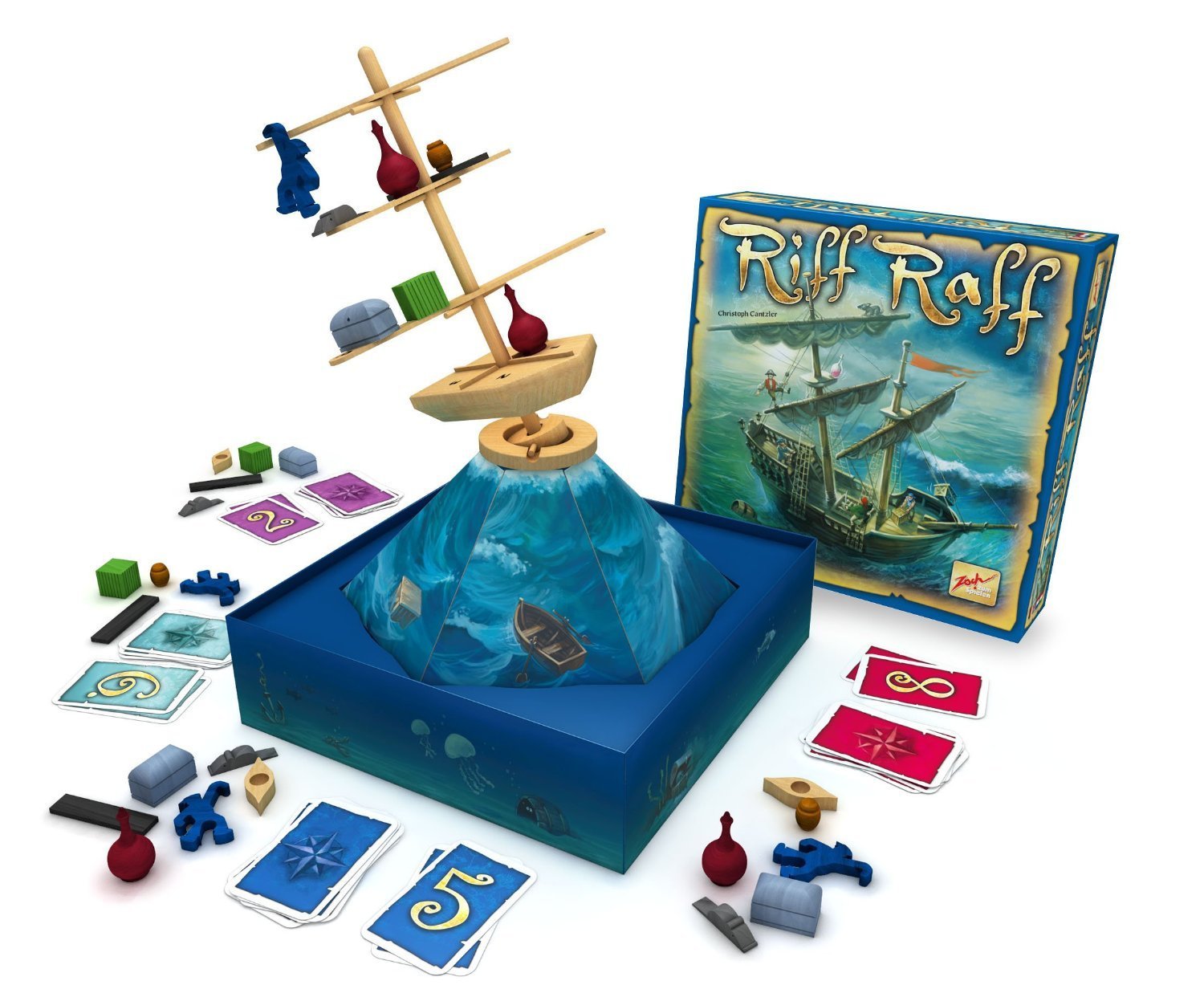 Und in Riff Raff werden ebenfalls wieder Holzteile verwendet, die man an den Einmaster hängen oder legen muss. Dabei entsteht in der Spielschachtel das Spielfeld und über den Wellen thront dann das Schiff, welches am unteren Teil eine Metallkugel hat, so dass das ganze hin und her schwingt.