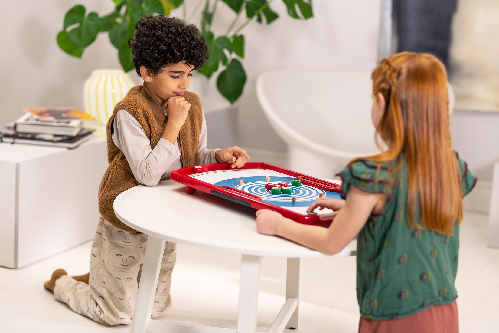 Doch auch Strategie und Geschicklichkeit gehen bei dem neuen BRIO Shuffleshot Hand in Hand. Ganz gleich, ob zunächst die Barrikade mit den gut platzierten Scheiben des Gegenübers oder direkt der Highscore anvisiert wird: Ziel ist es, die höchste Punktzahl zu erreichen, indem die Spieler ihre Scheiben möglichst nah an den roten Punkt in der Mitte des Spielbretts befördern.