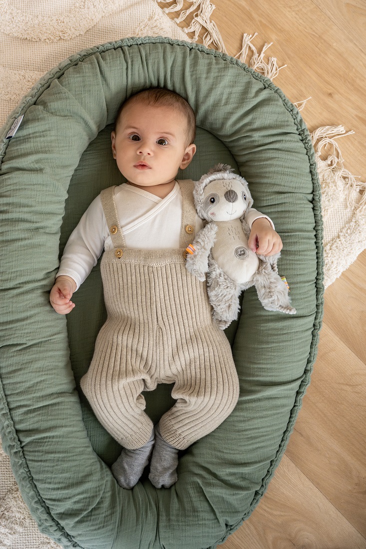 Die Einschlafhilfe Faultier aus der neuen Fehn-Kollektion besticht durch seine weiche Haptik und hochwertige Verarbeitung. Verschiedene Materialien wie Plüsch, Strick, Cord und Nicki sorgen für sensorische Vielfalt und regen zum Fühlen und Entdecken an.