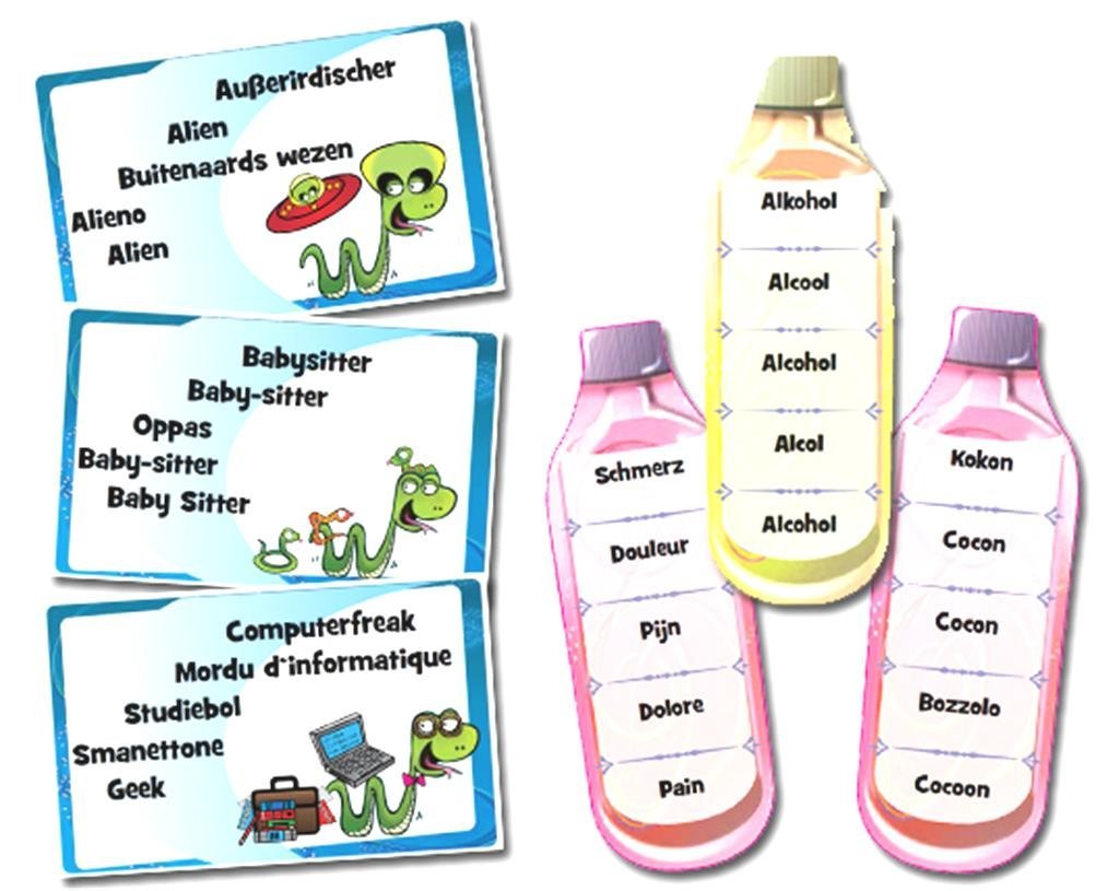 In die Flaschenregale werden 6 Wortkarten gesteckt. Die Begriffe sind in jeweils 5 verschiedenen Sprachen abgedruckt, sodass man wählen kann, in welcher man spielen möchte.