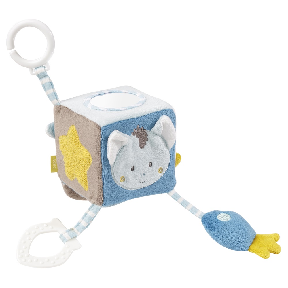 Der Fehn Activity-Würfel „Little Castle“ dagegen animiert mutige Drachen-Zähmer zum Streicheln. Unterschiedliche Stoffe und Texturen intensivieren das Fühlen, verschiedene Schlaufen laden zum Spielen ein und fördern damit Grob- und Feinmotorik.