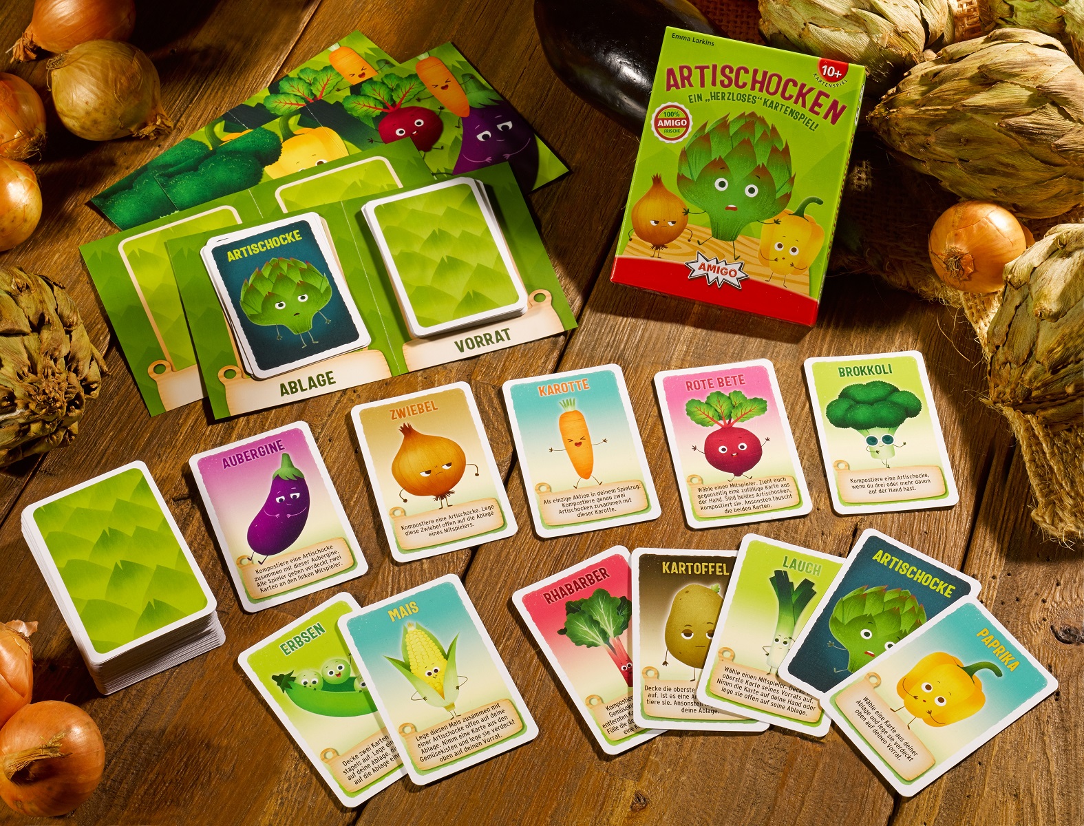 Bei der diesjährigen Frühjahrsneuheit Artischocken gilt es, die eigenen Artischocken-Karten loszuwerden. Ein Thema also, das Grünzeugverächter durchaus nachvollziehen können. Hingegen helfen andere Gemüsesorten wie Lauch, Radieschen oder Kartoffeln, das Spielziel zu erfüllen. Wer als Erster beim Nachziehen der Handkarten keine Artischocken auf der Hand hat, gewinnt das Spiel.