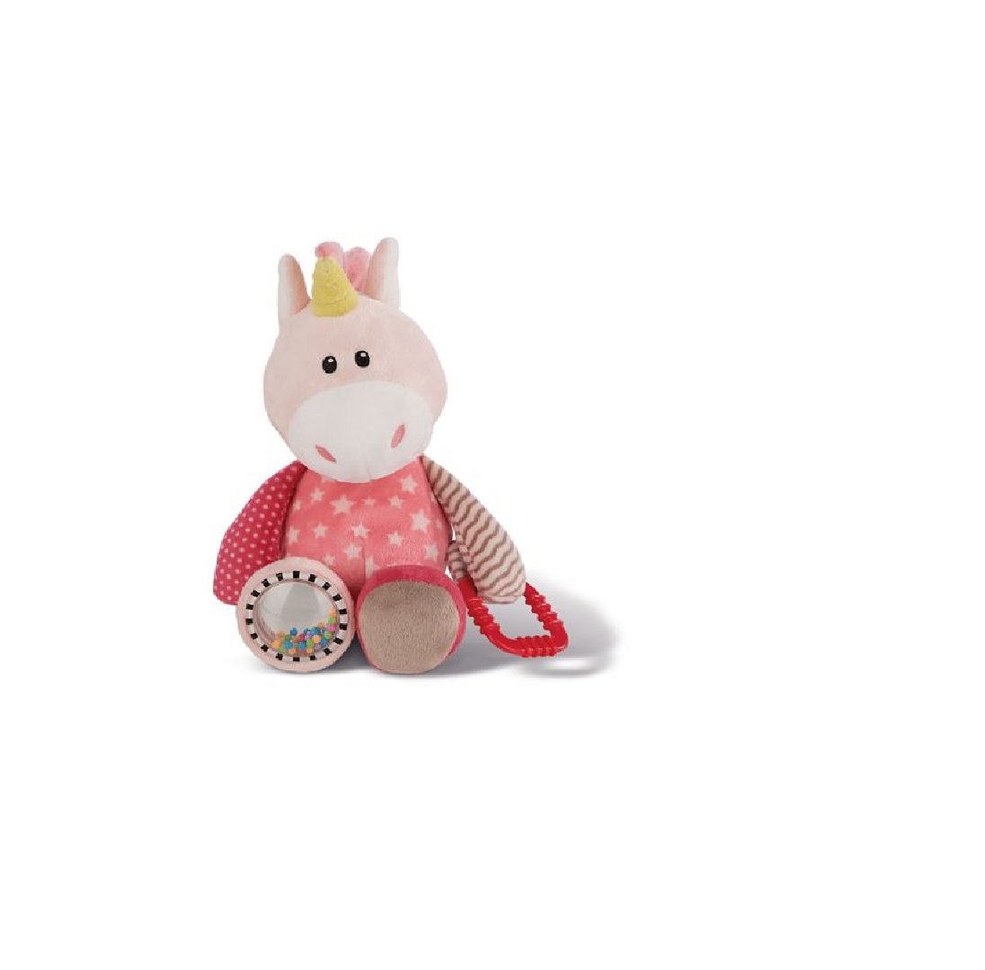 Auge-Koordination zu trainieren. Ab drei Monaten beginnen Babys dann gezielt nach Objekten zu greifen, sie festzuhalten und zu untersuchen. Die My First NICI Produkte Activity Schmusetier Einhorn mit Beißring und Rassel sowie ein plüschiger Greifling mit Holzring und Glöckchen, helfen Babys Grifftechniken weiterzuentwickeln.