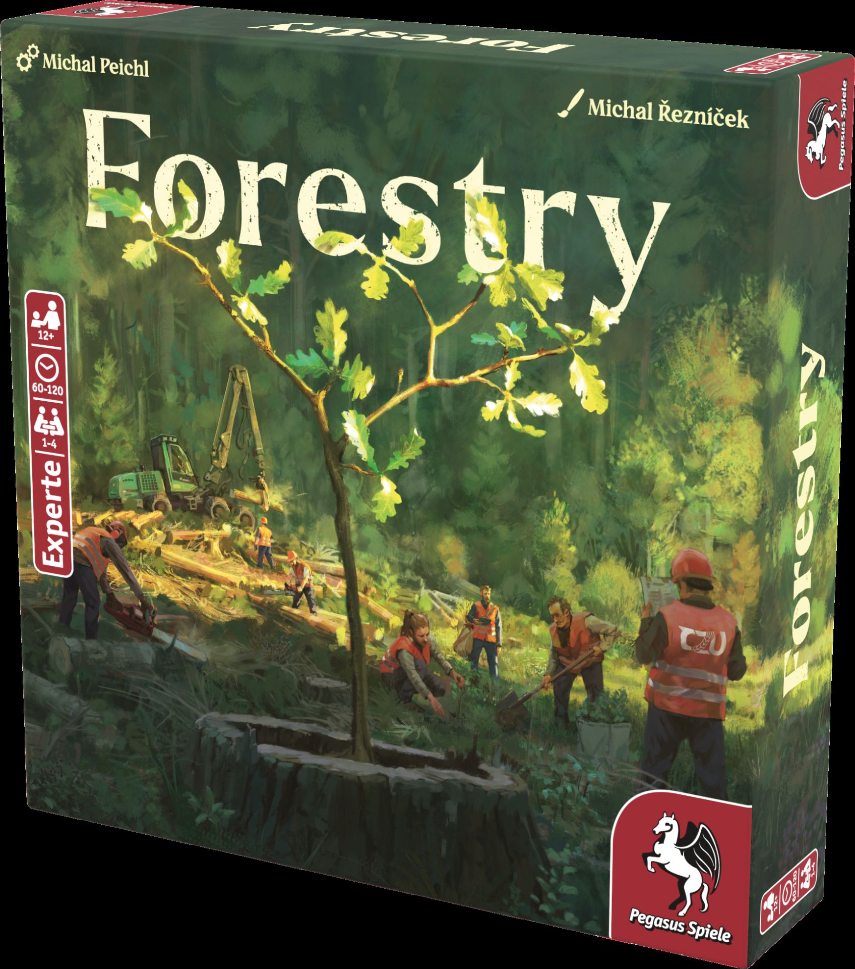 Als Forstleute ist es in Forestry Aufgabe von bis zu vier Spielenden ab zwölf Jahren, ein lukratives und zugleich nachhaltiges Unternehmen zu führen. Daher gibt es neben Aktionen wie Holz ernten und Aufträge erfüllen auch Wiederaufforsten und Wald schützen.