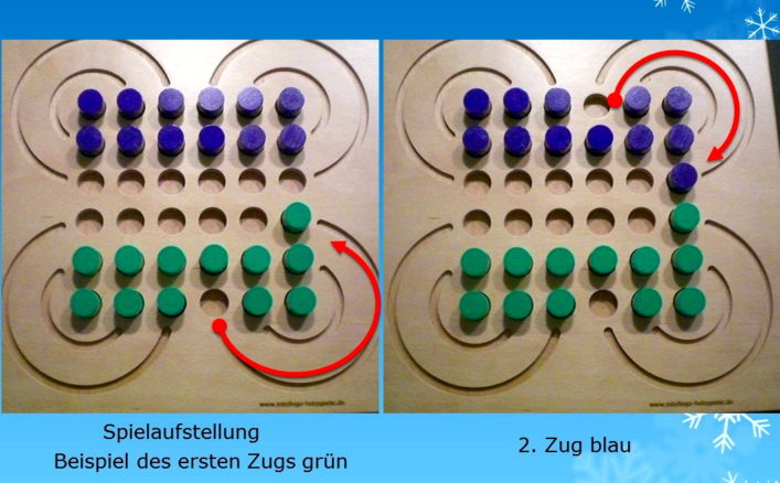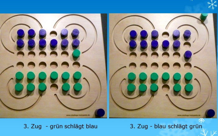 Wie lange Anfahrt und Auslaufweg sind, spielt keine Rolle. Zug um Zug werden die Spielsteine des Gegners dezimiert. Wer einen Stein in einer Endlosschleife über die vier Flügel des Schmetterlings hat, hat eine strategische Position erreicht. Er kann jeden gegnerischen Stein werfen, der sich ihm in den Weg stellt. Ein überragender Vorteil, der sehr schwer zu brechen ist.