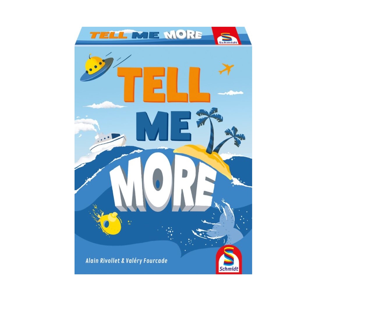 - Tell Me More: Typ: Kooperatives Erzählspiel | Marke: Schmidt Spiele® | Anzahl Spielende: 3-8 | Alter: ab 10 Jahren | Zeit: ca. 15 Minuten | Preis: 10,49 Euro (UVP)