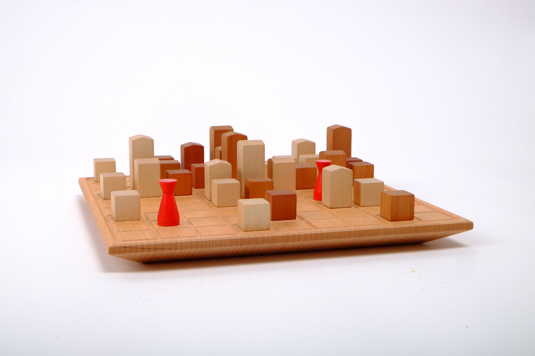 Gebaut werden darf nur dort, wo sich die Blickrichtungen der beiden Spielfiguren kreuzen. Und da auch Architekten nicht durch Gebäude oder um die Ecke schauen können, will jedes Versetzen gut überlegt sein. Am Ende zählen nur die Stadtviertel, in denen beide Spieler Gebäude besitzen.