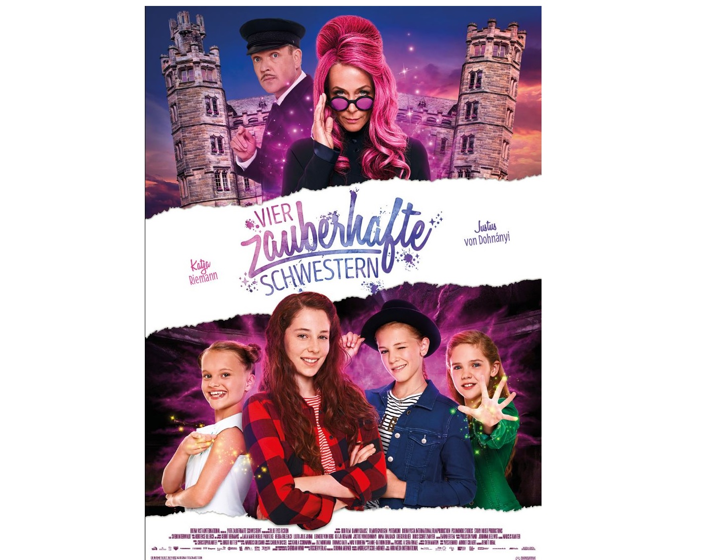 Als Hauptdarstellerinnen wurden unter Hunderten von Bewerberinnen die Newcomerinnen Laila Marie Noelle Padotzke, Leonore von Berg, Lilith Julie Johna und Hedda Erlebach ausgewählt. Grandios gibt Katja Riemann („Fack ju Göhte“-Filme, „High Society“) eine Galavorstellung als böse Glenda, die Kröten rülpst und ihren, von Justus von Dohnányi („Timm Thaler oder das verkaufte Lachen“, „Der Vorname“) mit viel Witz gespielten Butler, schon mal in ein Wildschwein verwandelt. Anna Thalbach („Frau Ella“) ist als die gute Seele des Films zu sehen, Gregor Bloéb („Schweinskopf al dente“) und Doris Schretzmayer („Der beste Papa der Welt“) spielen die Eltern der vier Schwestern.