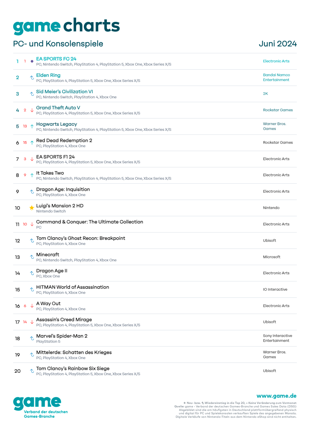 Neun weitere Titel schaffen den Wiedereinstieg in die Charts: „Sid Meier’s Civilization VI“ (2K) auf dem dritten Platz, „Dragon Age: Inquisition“ (Electronic Arts) auf dem neunten Platz sowie „Tom Clancy’s Ghost Recon: Breakpoint“ (Ubisoft), „Minecraft“ (Microsoft), „Dragon Age II“ (Electronic Arts) und „HITMAN World of Assassination“ (IO Interactive) auf den Plätzen 12, 13, 14 beziehungsweise 15. „Marvel’s Spider-Man 2“ (Sony Interactive Entertainment“, „Mittelerde: Schatten des Krieges“ (Warner Bros. Games) und „Tom Clancy’s Rainbow Six Siege“ (Ubisoft) landen auf den Plätzen 18 bis 20. An der Spitze steht auch im Juni die Fußball-Simulation „EA SPORTS FC 24“ (Electronic Arts).
