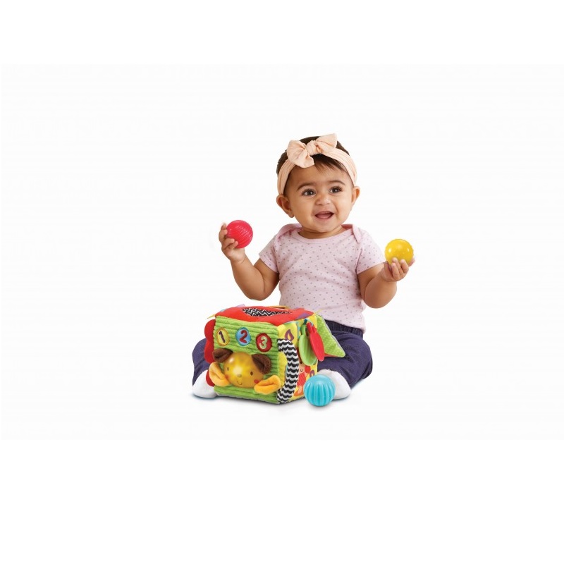 Kuscheliger Spielspaß von fünf Seiten: Der 1-2-3 Kuschelwürfel regt mit allerlei Spielelementen und Materialien die Sinne kleiner Entdecker an: So lassen sich zum Beispiel die drei farbenfrohen, weichen Plastikbälle mit verschiedenen Oberflächenstrukturen in den Würfel einwerfen, zwei bunte Anhänger helfen beim Zahnen, ein kleiner Spiegel fördert die Selbstwahrnehmung und zahlreiche Stoffelemente stimulieren den Tastsinn.