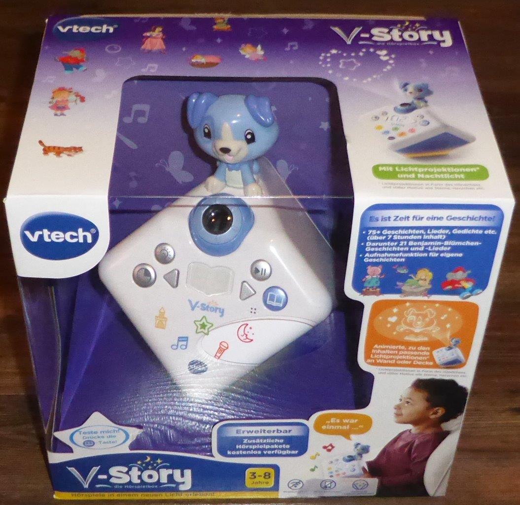 Die Vtech V-Story Hörspielbox verfügt über 80 integrierte Geschichten, Märchen, Gedichte, Lieder, Gute-Nacht-Geschichten, Traumreisen, Fabeln und Sagen. Über einen Download können weitere Geschichtenpakete kostenlos von Vtech heruntergeladen werden. (vtech.de/support/download-manager)
