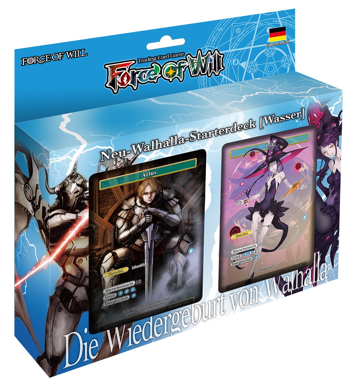 Die Wiedergeburt von Walhalla enthält 110 neue Karten, darunter weder Herrscher noch normale Zaubersteine, da diese im Neu-Walhalla-Zyklus ausschließlich in den vorgebauten Starterdecks zu finden sind. Sie sind ein idealer Einstieg in das Force of Will TCG und in den neuen Zyklus.