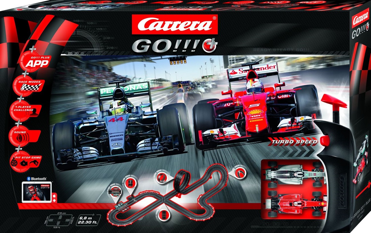Schon die kleinsten Formel-1-Fans ab 6 Jahren kommen bei Carrera voll auf ihre Kosten. Im brandneuen Carrera GO!!! Plus Next Race-Set tritt der diesjährige WM Zweitplatzierte, Lewis Hamilton, im Mercedes F1 W05 Hybrid gegen den Vierfachweltmeister Sebastian Vettel im Ferrari SF 15-T an. Auf der 6,8 Meter langen Rennbahn schenken sich die beiden Kontrahenten keinen Zentimeter.