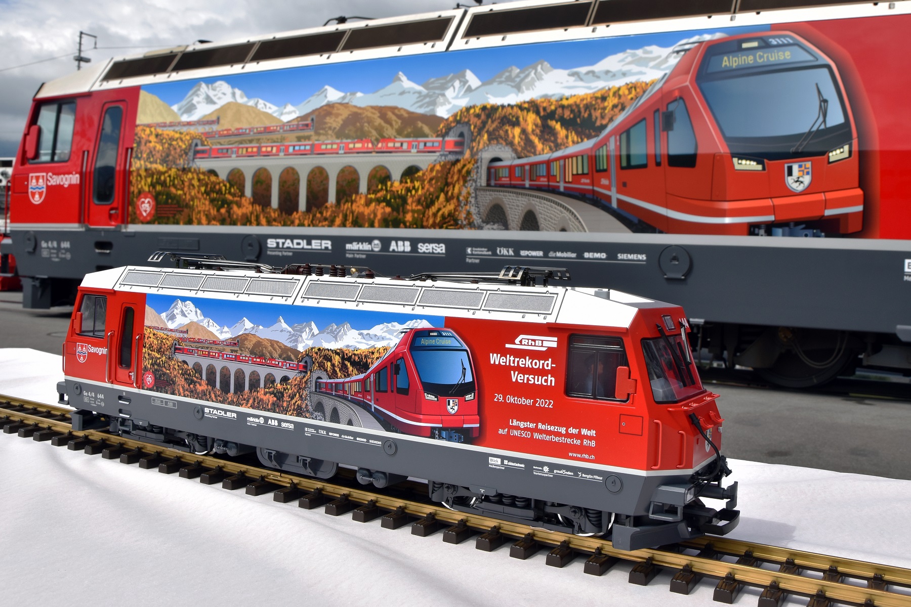 Er präsentierte eine Elektrolok der Baureihe Ge 4/4 III mit der Betriebsnummer 644, die mit einer farbenfrohen Gestaltung im Streckennetz der RhB auf den Weltrekordversuch aufmerksam macht. Der Modellbahnhersteller Märklin wird die spektakuläre Aktion als Partnerunternehmen unterstützen und begleiten.