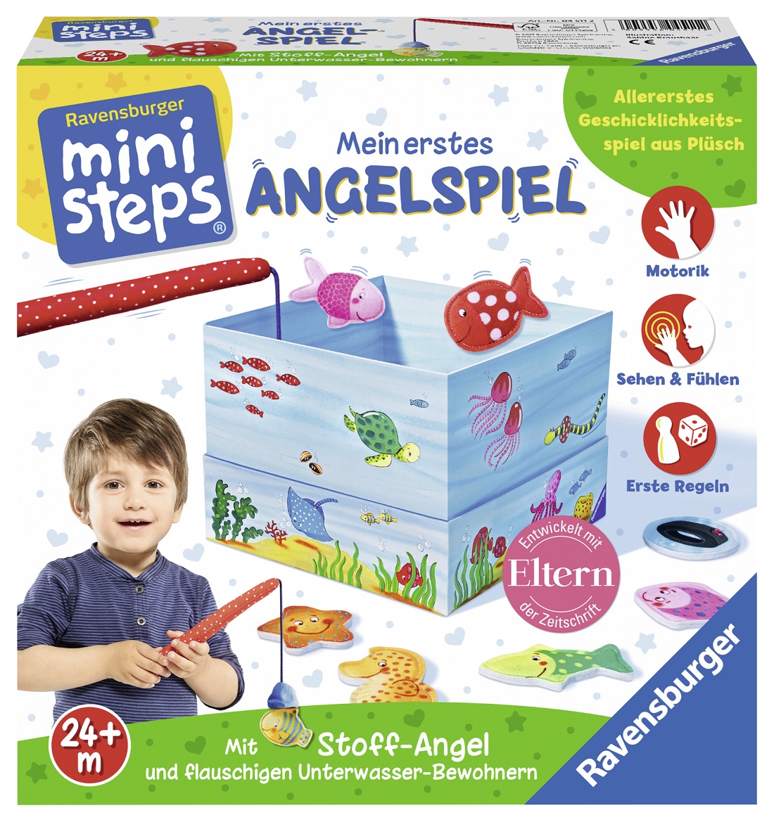 Mein erstes Angelspiel ist die Kleinkind-Version des klassischen Geschicklichkeitsspiels mit weicher Stoff-Angel und -Fischen. Das Angeln fördert bei Kleinkindern ab zwei Jahren die räumliche Vorstellungskraft und feinmotorische Fähigkeiten.